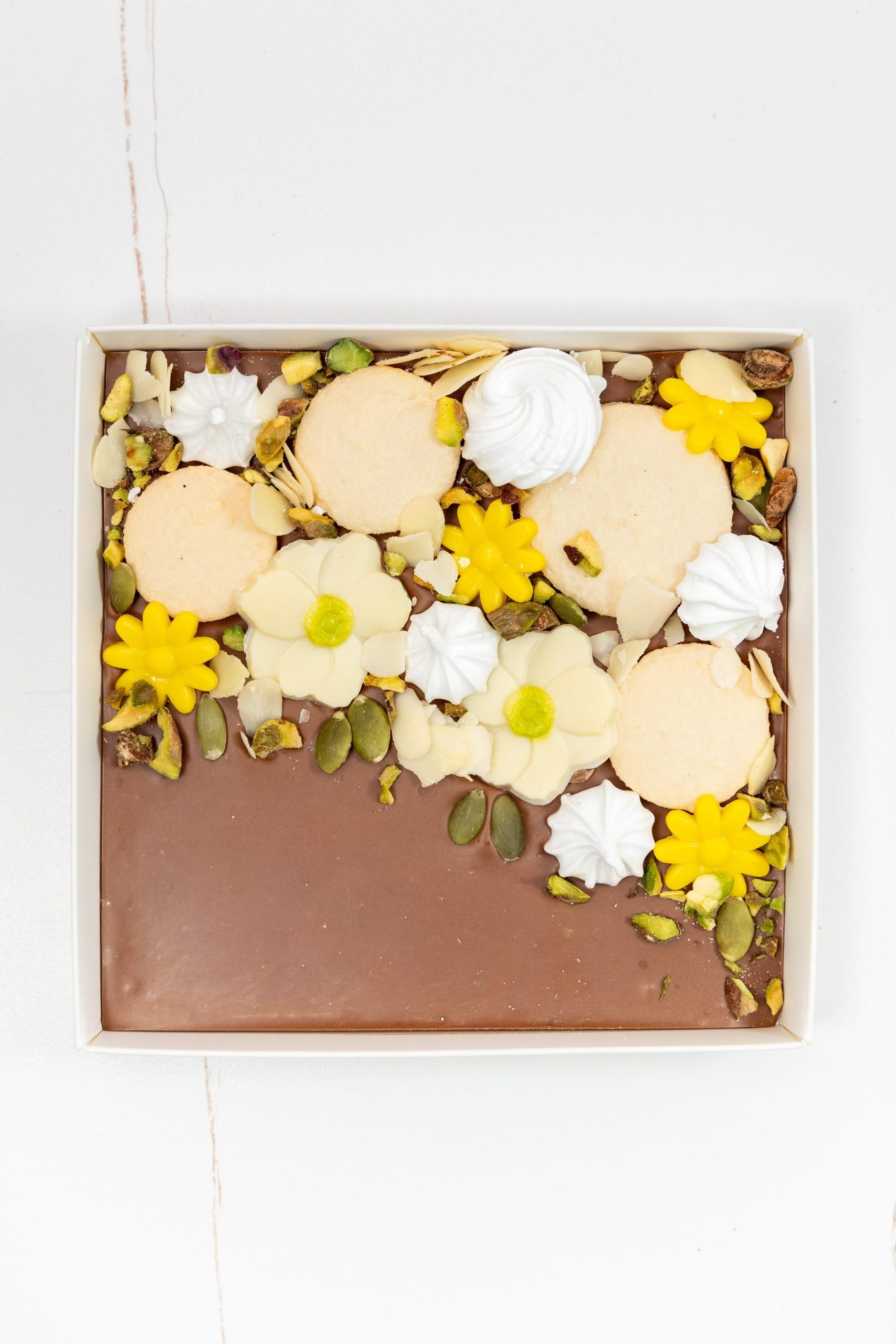 Mleczna czekolada o aksamitnym, kremowym smaku, ozdobiona chrupiącymi kawałkami migdałów i pistacji oraz delikatnymi, żółtymi kwiatkami w subtelnym, wiosennym stylu. Jej aksamitna słodycz doskonale współgra z chrupiącymi migdałami i pistacjami, tworząc harmonijne, pełne elegancji połączenie smaków.