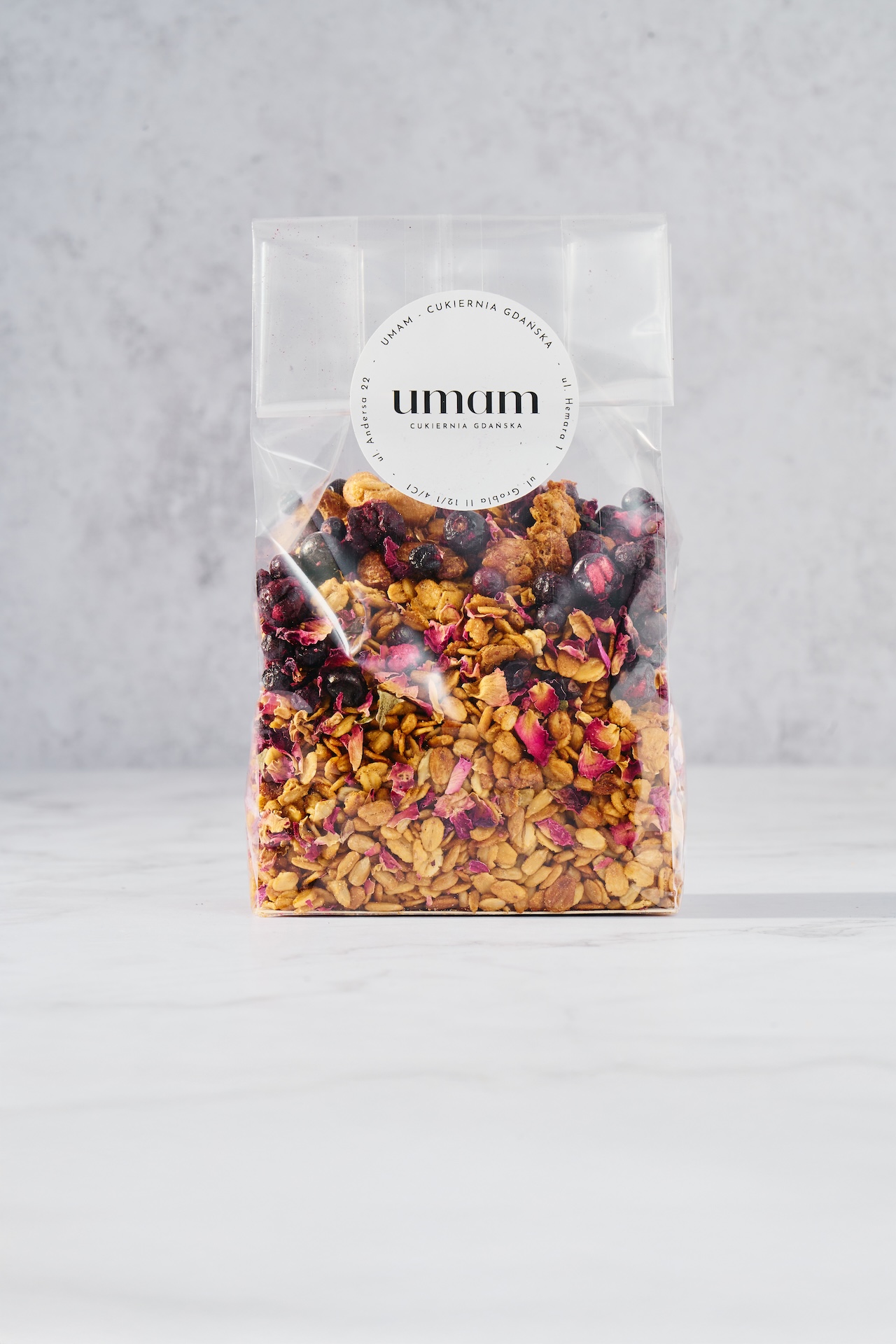 Skład: płatki owsiane instant, ziarno słonecznika, orzech nerkowca, olej rzepakowy, miód naturalny, białko kurze, liofilizowana porzeczka, płatki róży, woda różana.