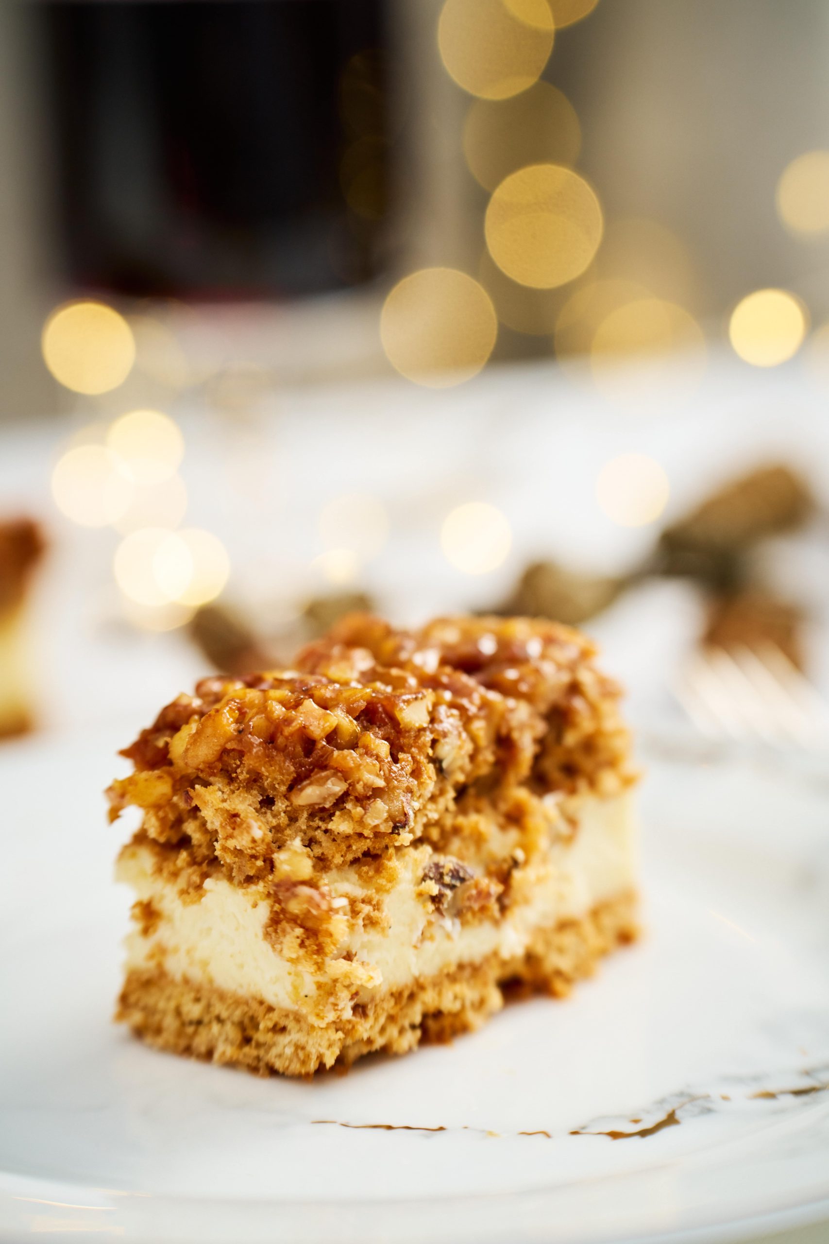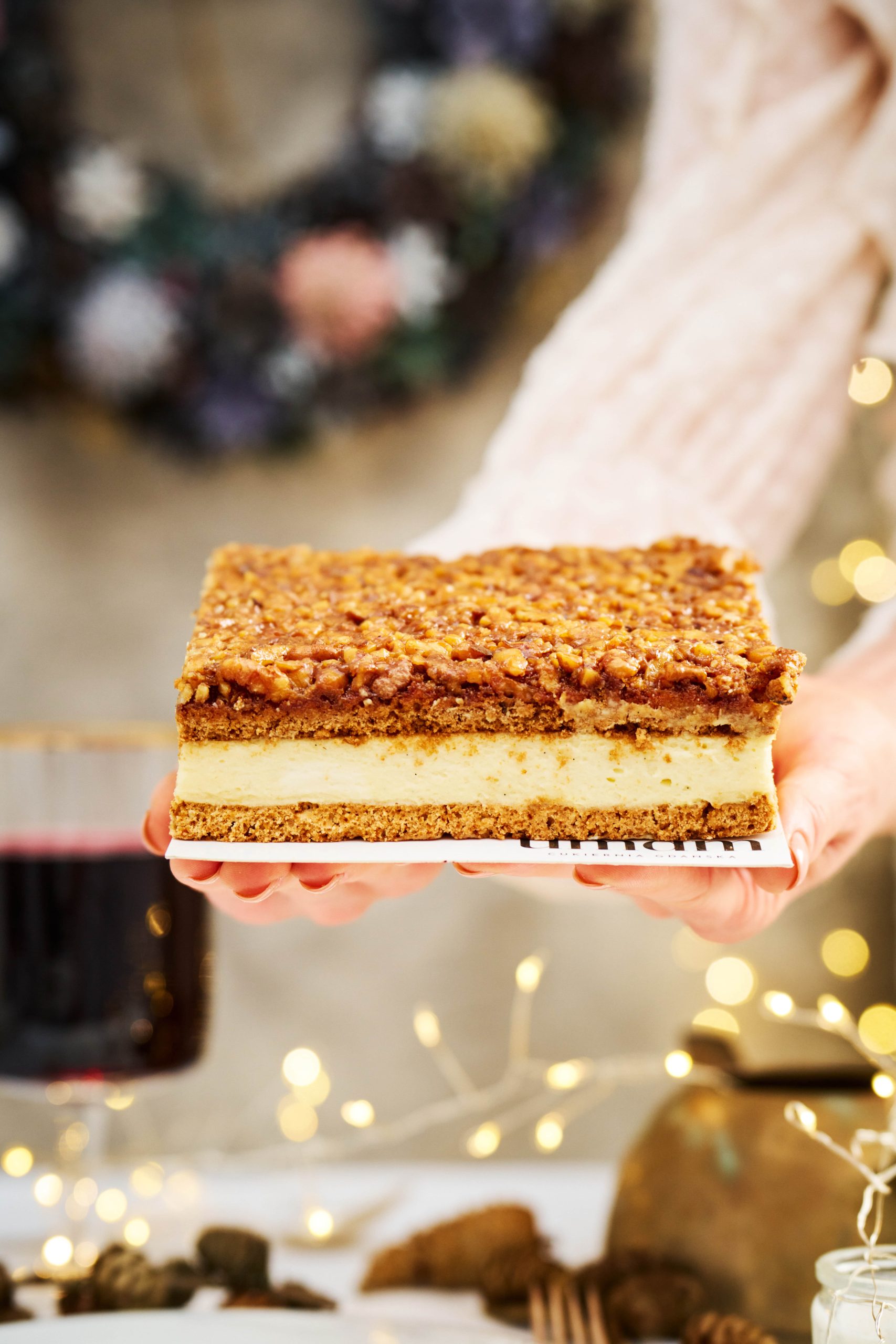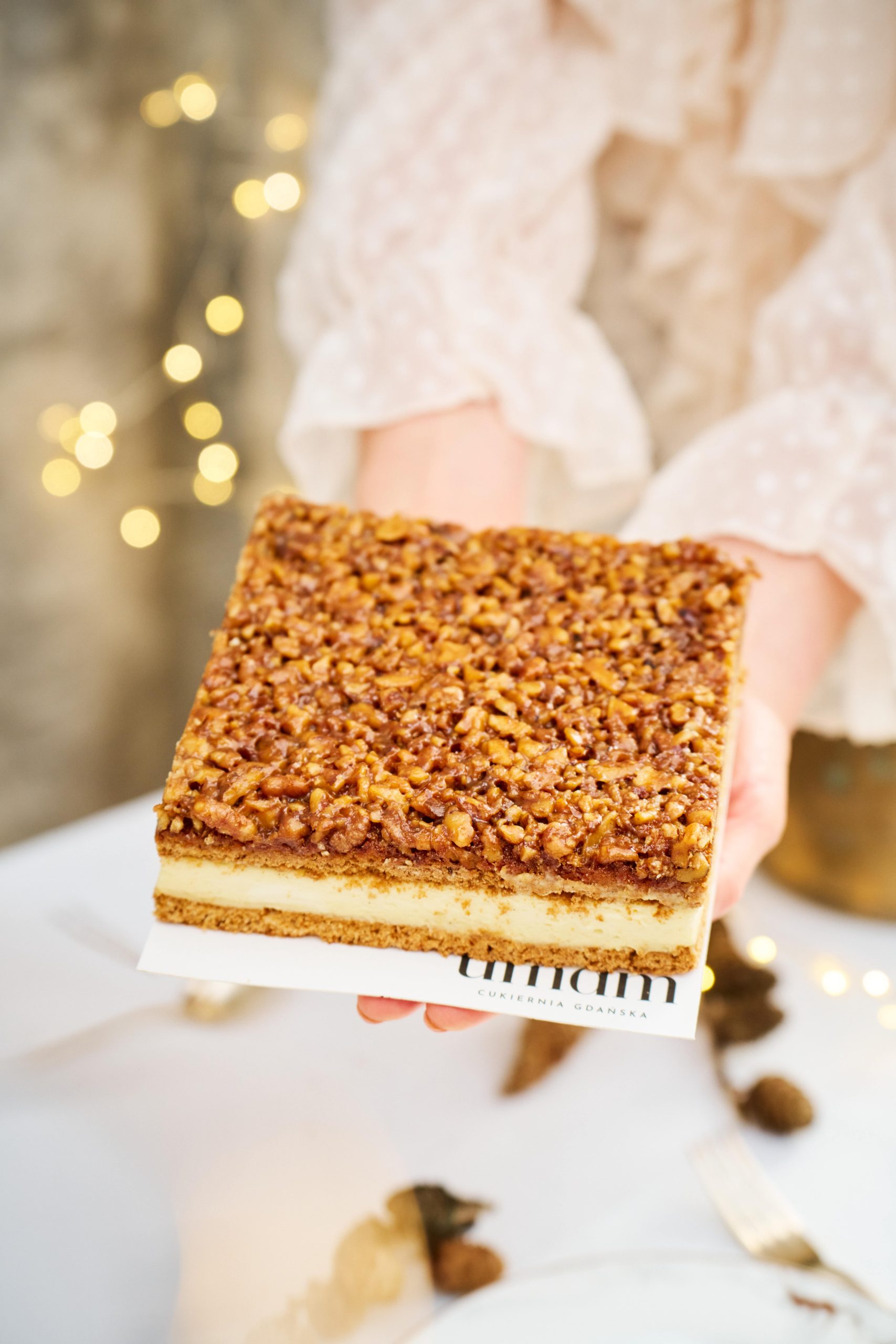 Miodowe ciasto przełożone waniliowym kremem dyplomat, udekorowane orzechami włoskimi zapieczonymi z miodem. Każdy kawałek to harmonia słodkiego kremu i aromatycznych orzechów, w klasycznym, świątecznym wydaniu UMAM.