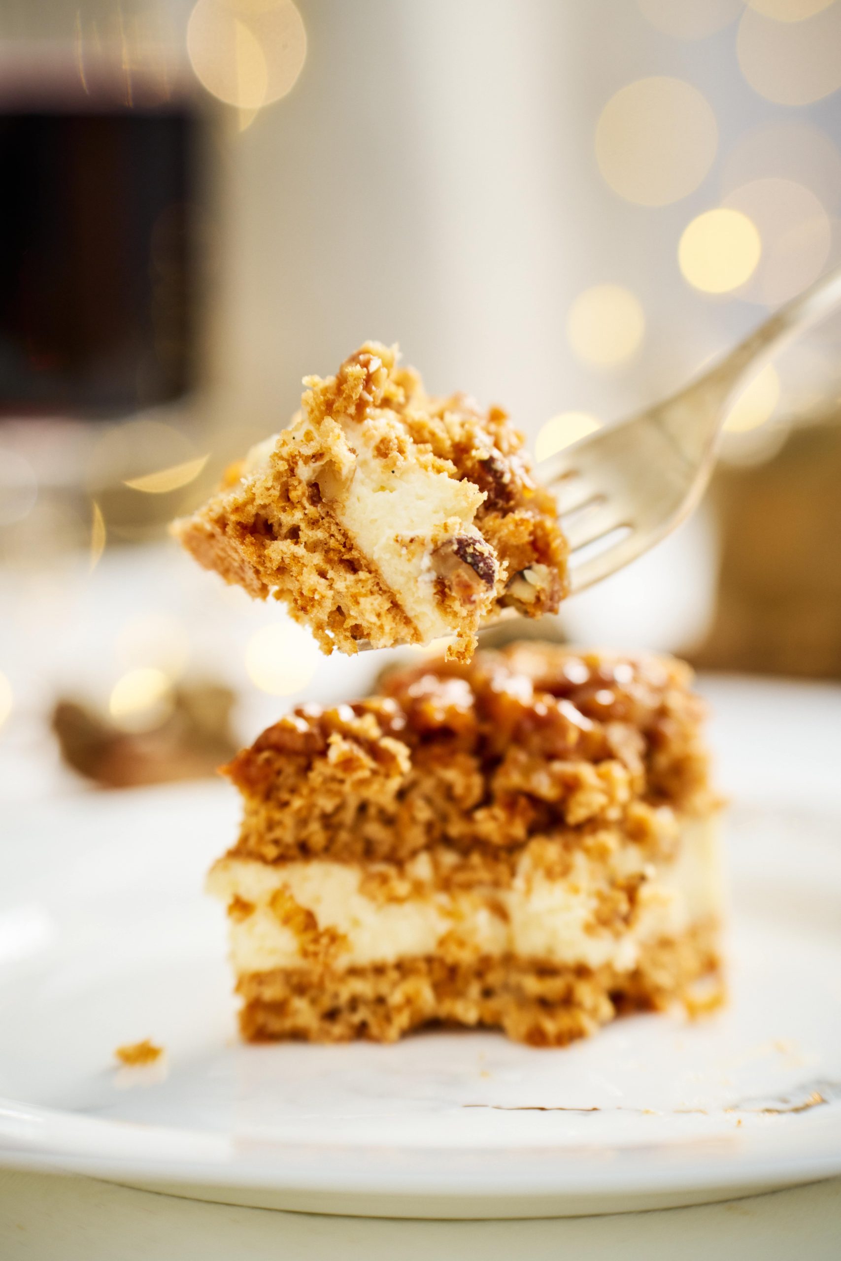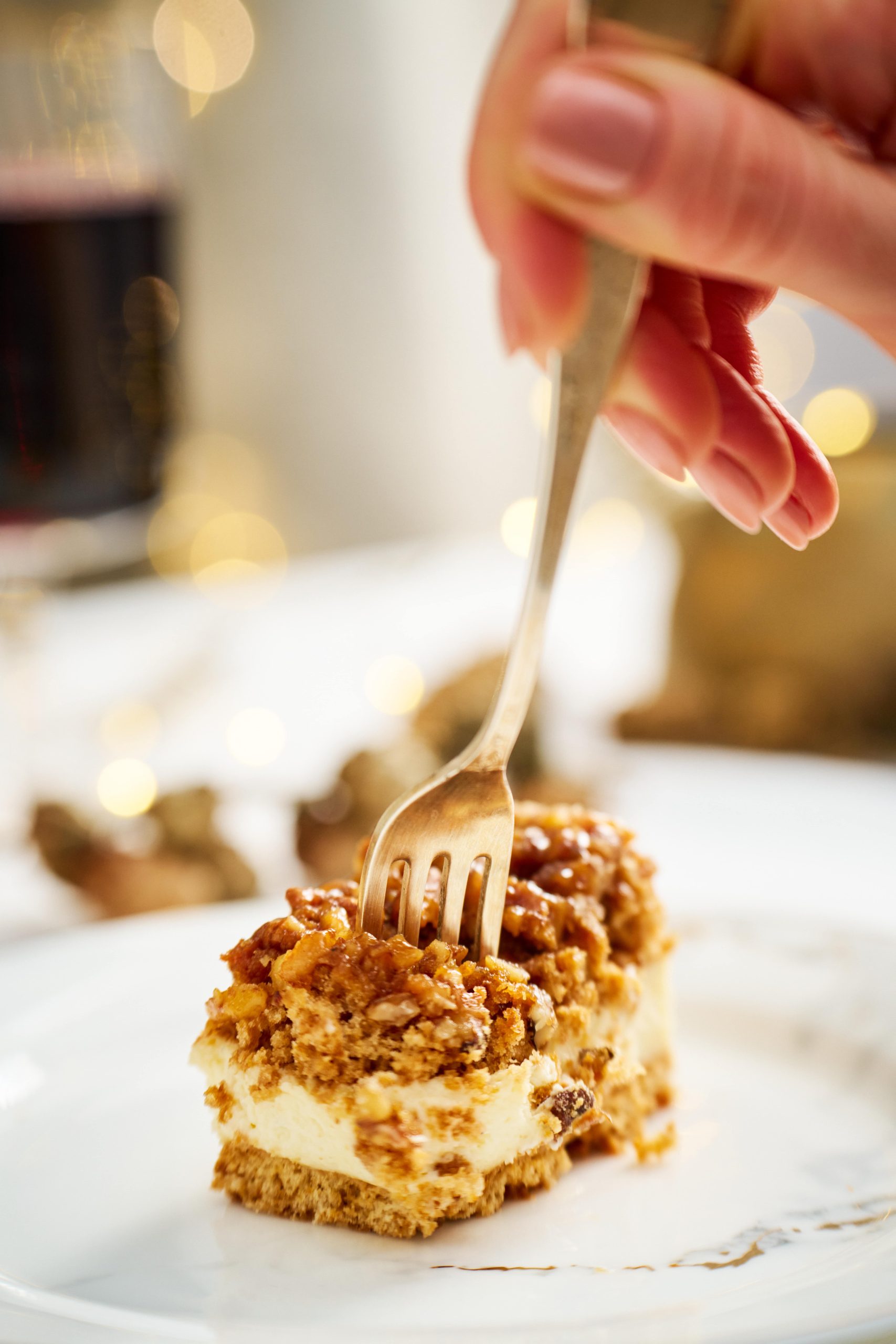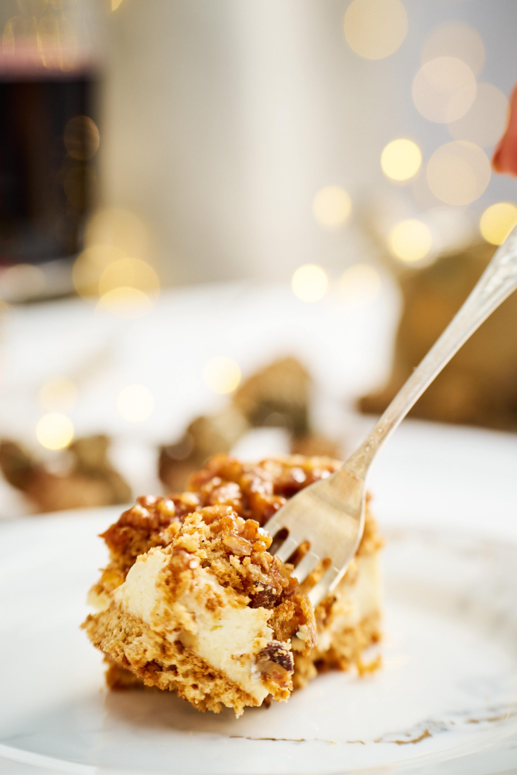 Miodowe ciasto przełożone waniliowym kremem dyplomat, udekorowane orzechami włoskimi zapieczonymi z miodem. Każdy kawałek to harmonia słodkiego kremu i aromatycznych orzechów, w klasycznym, świątecznym wydaniu UMAM.