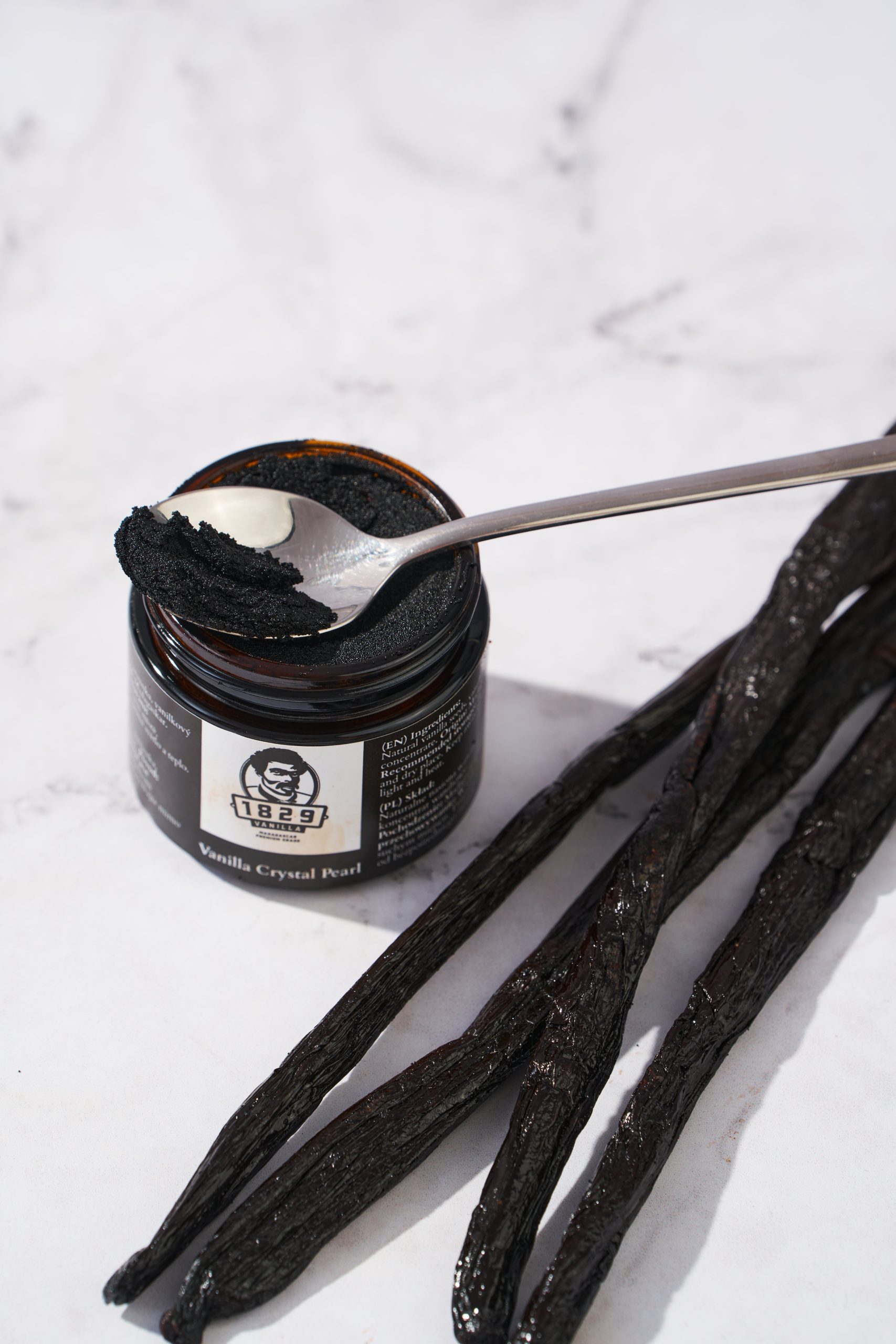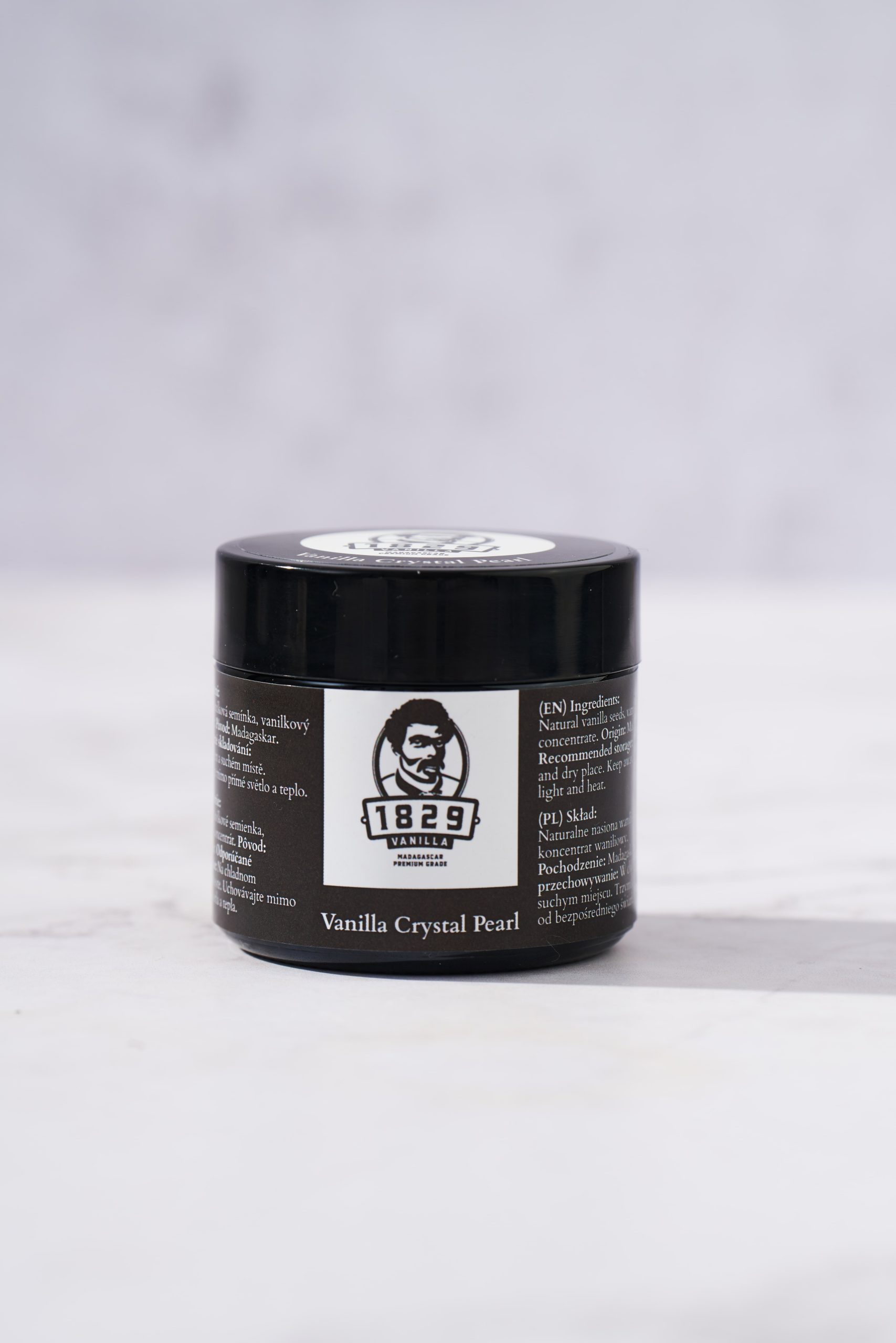 Delikatne, połyskujące kryształki powstałe z wyskrobanych ziaren zawierających ponad 90% prawdziwego kawioru waniliowego z Madagaskaru, wzbogacone naturalnym koncentratem wanilii. Te rzadkie perełki uwalniają skoncentrowane nuty autentycznego aromatu i smaku, dodając deserom, czekoladom i koktajlom elegancji oraz głębi — niczym biżuteryjne wykończenie chwil wartych celebracji.